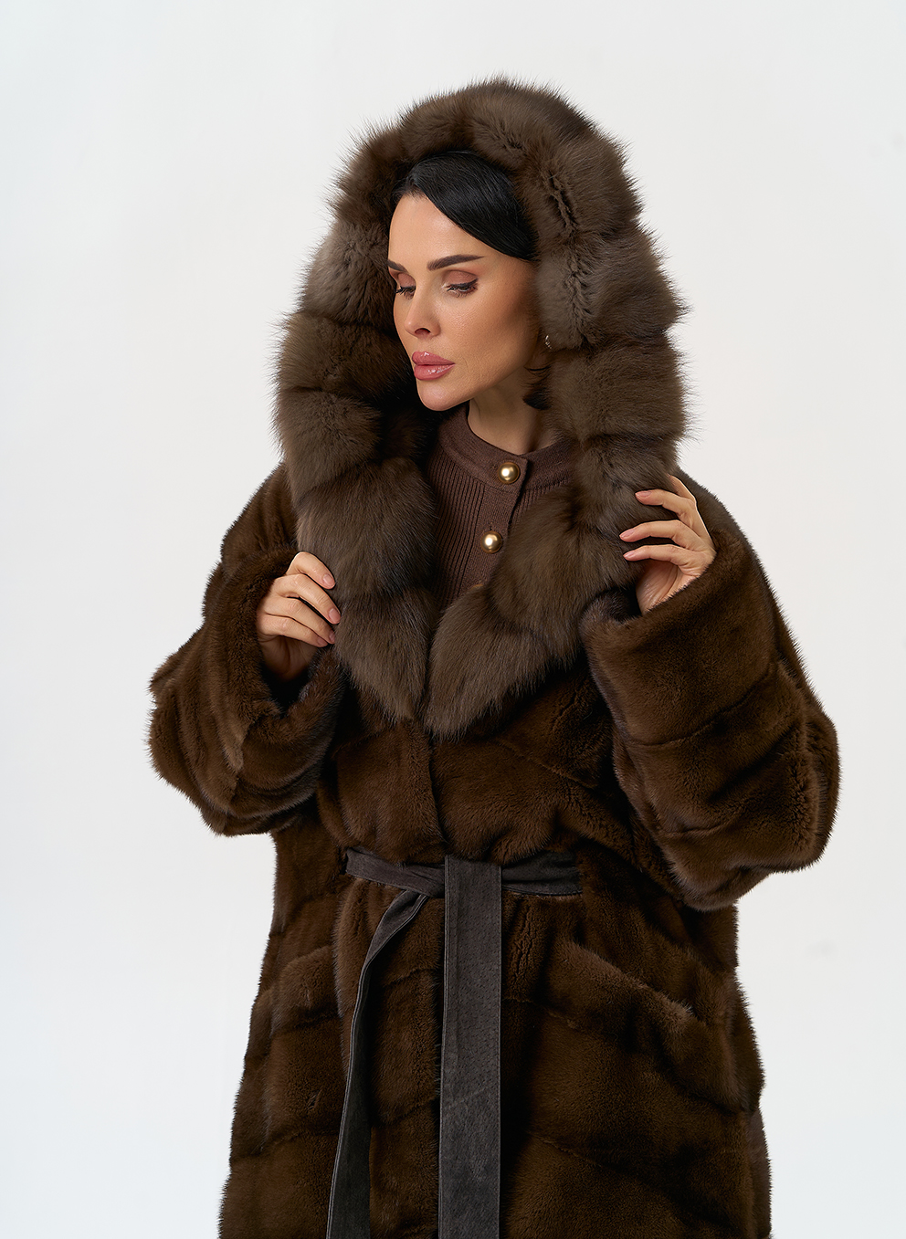 Тип ворота - капюшон, отделка куница